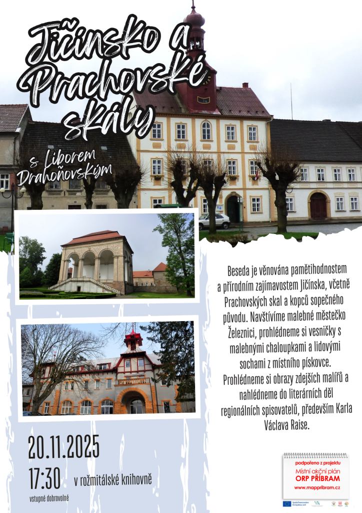 Na žádost účastníků jeho minulé besedy vás tentokrát zavede na Jičínsko a do Prachovských skal. Čekají vás místní pamětihodnosti a přírodní zajímavosti, památky barokního stavitelství věhlasných architektů, povolaných Albrechtem z Valdštejna, malebné městečko Železnice, vyhlídky, z nichž je vidět až do Krkonoš a mnoho dalšího, včetně Prachovských skal a dalších kopců sopečného původu. Nezapomeneme ani na místní malíře a regionální spisovatele. Těšit se můžete na poutavé vyprávění, cestovatelské zážitky a spoustu jedinečných fotografií.